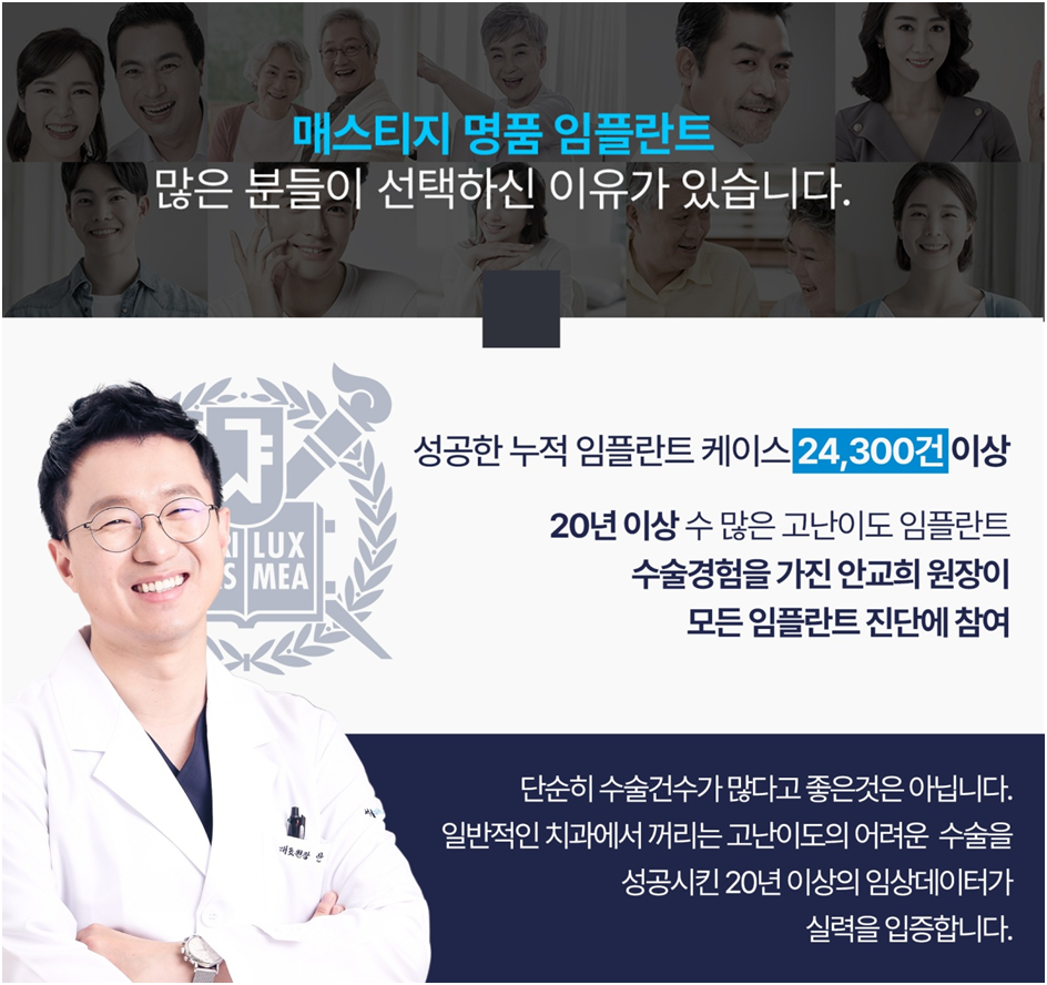 서울매스티지치과는 15년 이상 경력을 보유하고 있는 원장님을 비롯한 숙련된 의료진이 위생적인의료 도구와 최첨단 수술 시스템을 사용해 원래의 기능을 회복할 수 있습니다. 임플란트 수술에 사용하는 인공 치근은 치아를 지탱할 만큼 강하고, 잇몸뼈와 단단히 유착될 수 있도록 무해한 재질을 사용합니다.