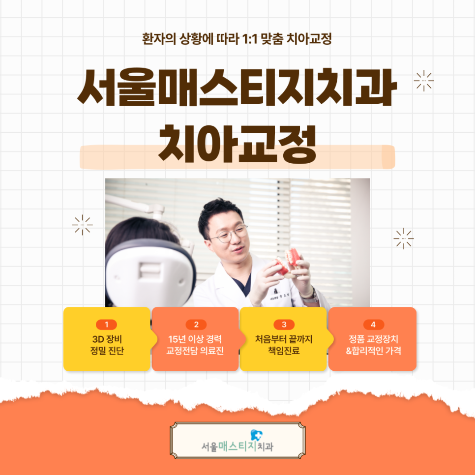 반포교정치과 서울매스티지치과에 교정 또는 재교정을 위해 내원한다면 교정 효과를 늘이기 위한 개인별 유지관리 계획을 안내해 드리겠습니다.