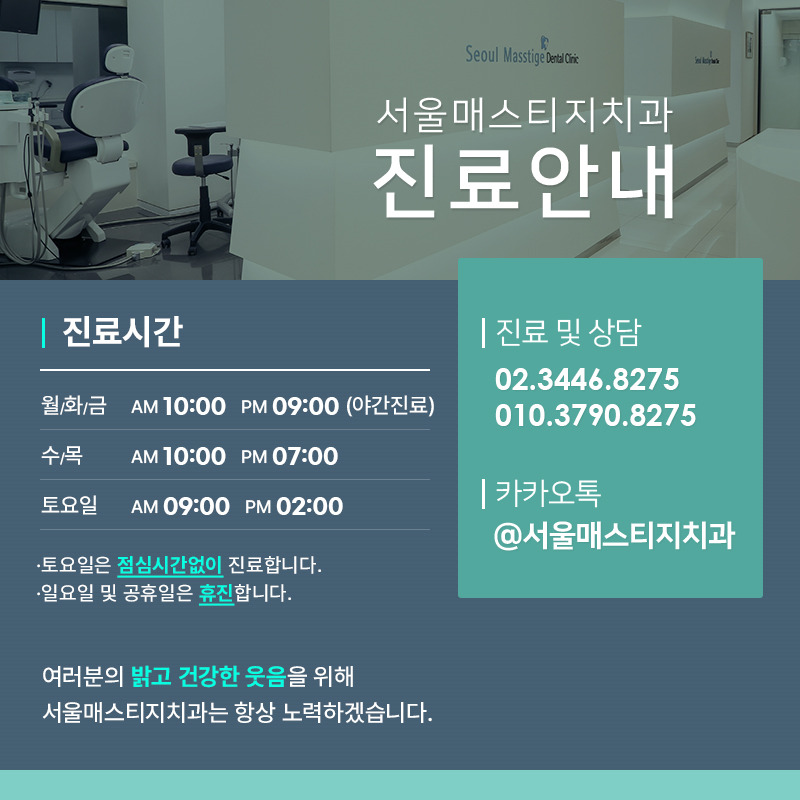 교정은 장치를 시작하는 순간보다 끝까지 안정적으로 유지되는 과정이 더 중요합니다. 서울매스티지치과는 치료 계획 수립부터 진행 과정 체크, 교정 후 사후관리까지 확인하며 안정적으로 교정이 이루어질 수 있도록 노력하고 있습니다. 만약 현재 교정을 고민하시거나 통증으로 인해 고민이 있으시다면 언제든지 서울매스티지치과를 방문하여 상담을 받아보시길 바랍니다.